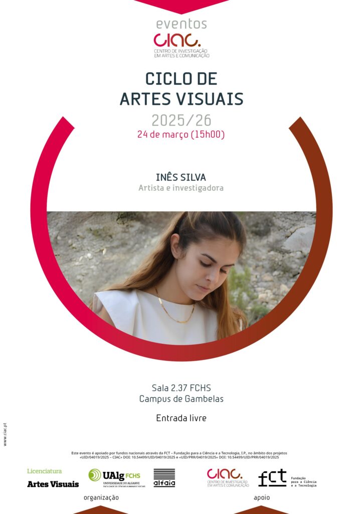 The Portuguese artist and researcher Inês Coelho da Silva (b. 1996), based between Santa Maria da Feira and Milan, will be present on 24 March at 3:00 p.m. in room 2.37 at the Gambelas campus, FCHS, as part of the Visual Arts Cycle.
