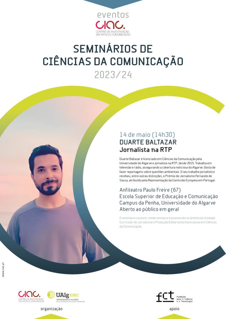 The next Communication Sciences Seminar, dedicated to Journalism, will be led by Duarte Baltazar, a journalist at RTP. The session will take place on May 14th at 14:30 in the Paulo Freire Auditorium (room 67) at the School of Education and Communication, University of Algarve.